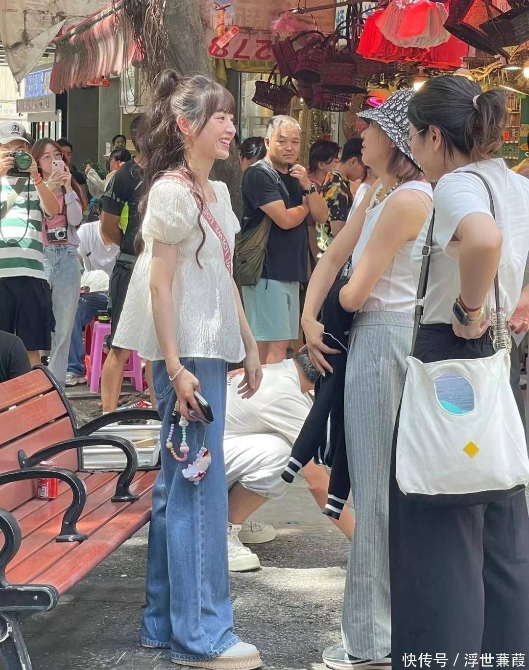 有次被拍到在上海武康路漫步,她身着纯棉质地的米白色衬衫,下搭浅蓝微喇牛仔裤,发丝微扬,步履轻盈,阳光洒落肩头时,路人纷纷驻足凝望,忍不住感叹“像从日系胶片里走出来的邻家学姐”。